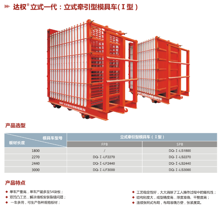 達權復合夾芯板立式模具車是達權首創的立式模具車,用于生產輕質復合夾芯板,改變了傳統的臥式模具車生產形式,相對于傳統復合夾芯板臥式車,立式模具車更利于倒模拆模,大大提高了生產效率,降低了人工成本。性能已達到國際同類產品的領先水平。免費提供本公司品牌、商標、工藝流程的技術培訓,為建廠公司(合作廠家)全方位提供生產、安裝、銷售的扶持及服務。