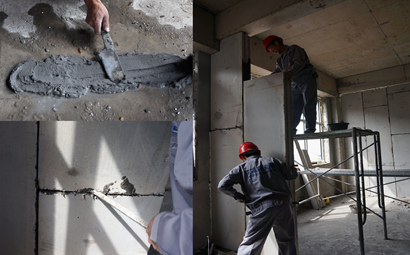 用電動工具攪拌粘合劑,按配方均勻拌合,干濕適中,粘合劑要隨配隨用,并應在30min內用完。墻板與地面,與其他墻、柱接觸處涂抹粘合劑,由二人將墻體按墻體線扶正就位,一人拿撬棒,就位后,由一人在一側推擠,準確對線,一人用撬棒將墻板撬起,邊撬邊擠,并通過撬棒的移動,使墻板移在線內,是粘合劑均勻填充接縫,使凹凸楔口連接緊密,互相咬合,楔口內粘合劑飽滿(以擠出漿為宜)。