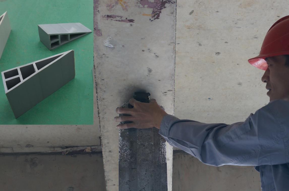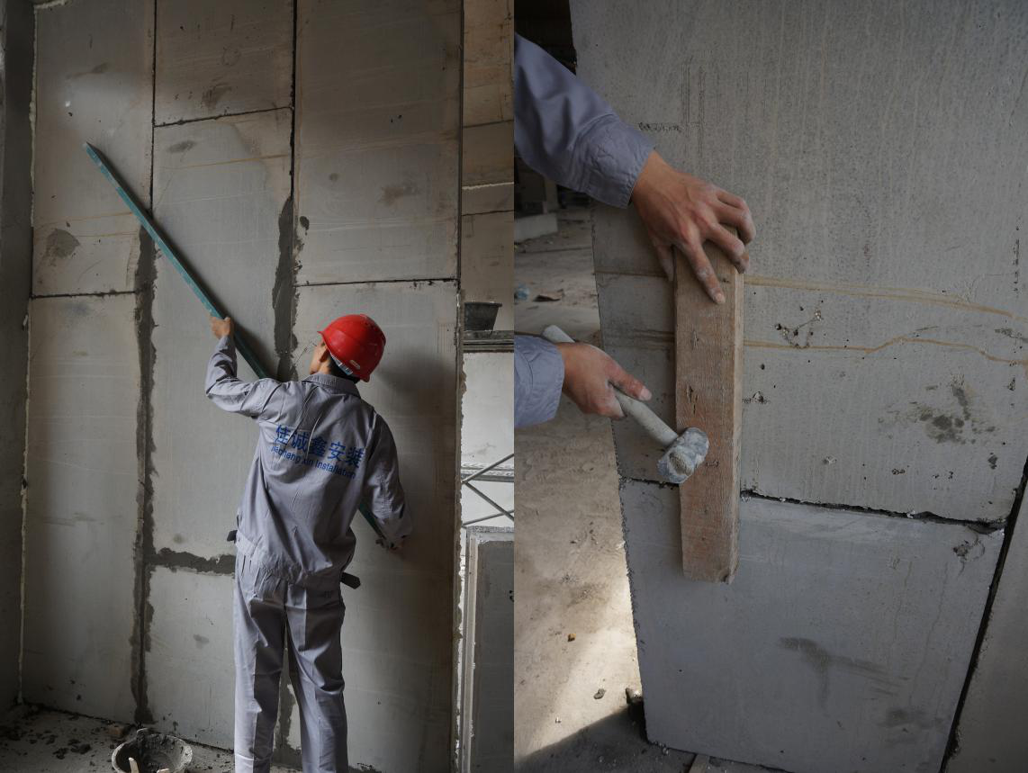 調校時一人手拿靠尺緊靠墻板面測垂直度、平整度,另一手拿鐵錘擊打膠楔。調整墻板頂部不平處:一人拿靠尺,另一人拿木方靠在墻板上,用鐵錘在木方上輕輕敲打校正(嚴禁用鐵錘直接擊打墻板)。重復檢查平整度、垂直度,直至達到要求為止(檢查垂直度時鋁合金靠尺上吊掛線錘),校正后用刮刀將擠出的膠漿刮平補齊,依次安裝。