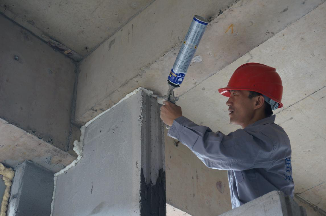 待校正墻板后,用泡沫縫劑填縫。